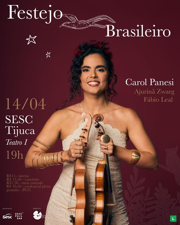 Entrada: R$ 15 (inteira), R$ 13,50 (convênio), R$ 10,50 (credencial plena), R$ 7,50 (meia-entrada para casos previstos por lei, estendida a professores e classe artística mediante apresentação de registro profissional e programa Mesa Brasil), gratuito (público PCG), vendas no site https://www.ingresso.com/evento/festejo-brasileiro-carol-panesi-trio